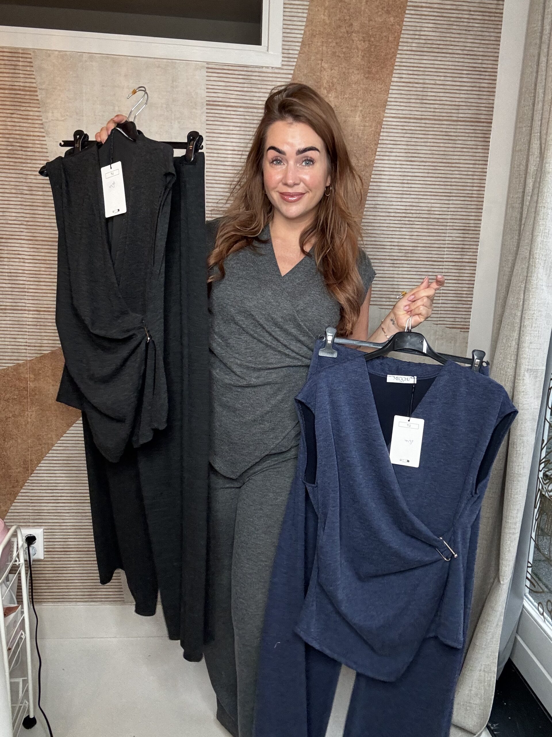Dit heerlijke pak is comfy maar toch stylisch en netjes. Door de Broche op de top heb je het comfortabele van een joggingpak maar is het toch chic. Het pak is one size en geschikt van maat s tot en met l. Hij is er in het licht grijs, donker grijs en blauw.
