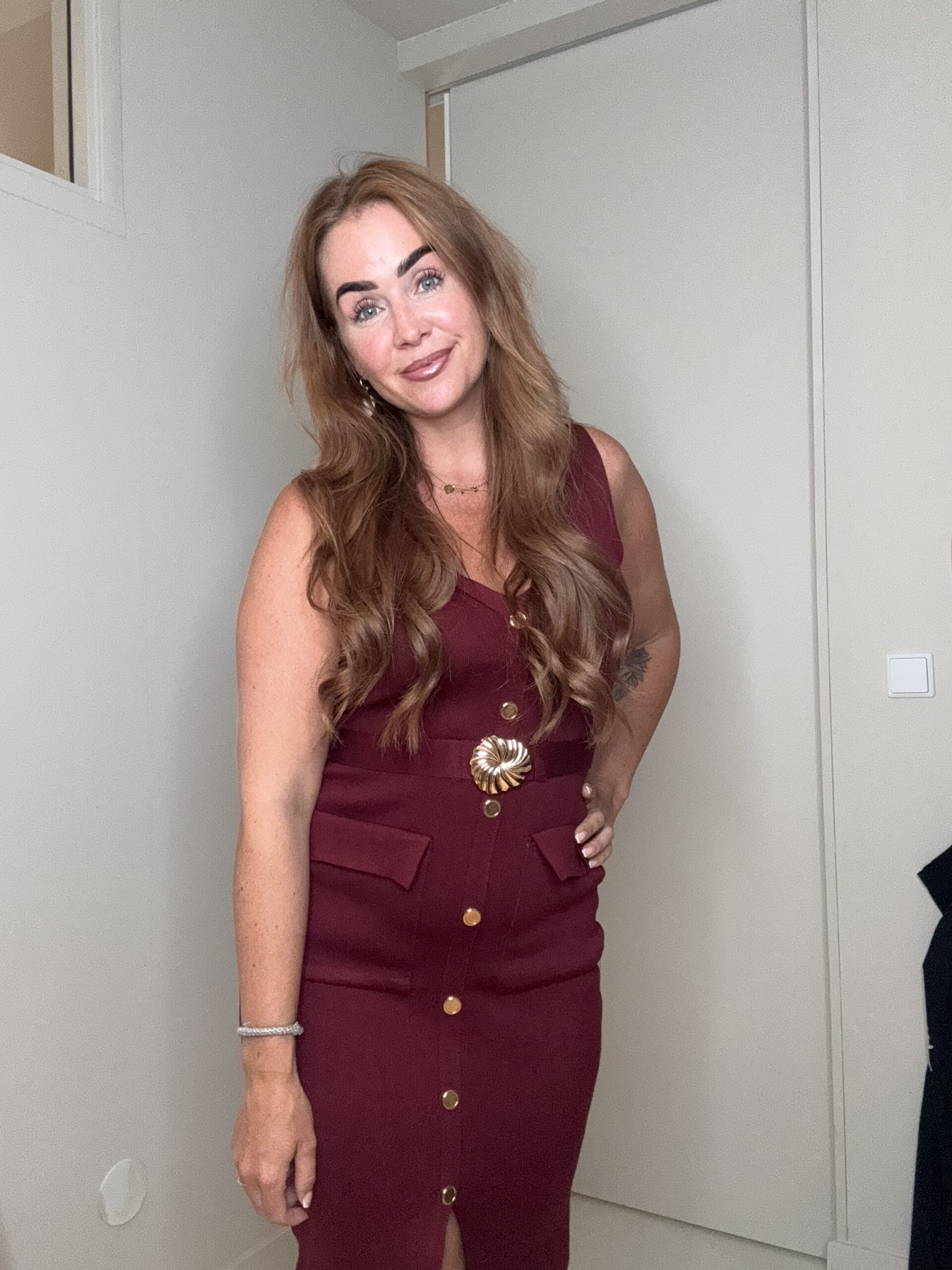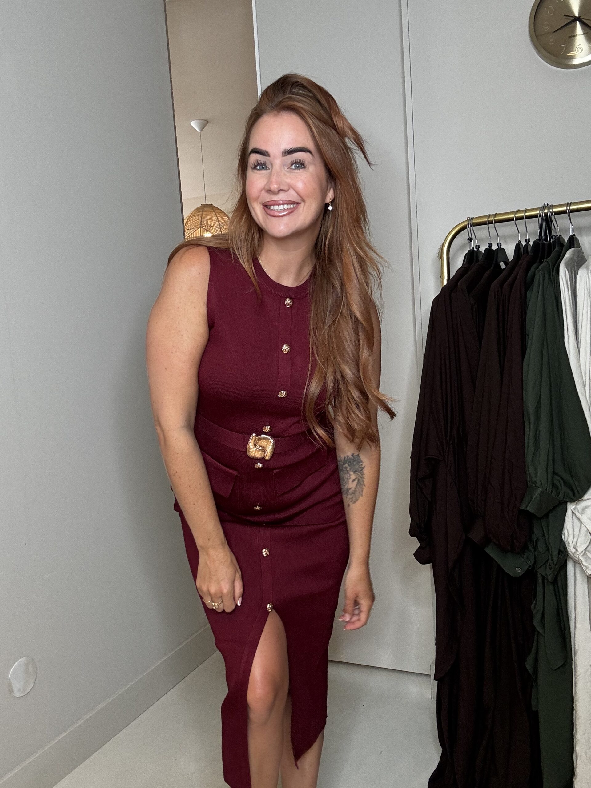 Deze prachtige jurk is zo mooi afgewerkt. De stof is mooi dik en slankt enorm af! In maat S/M & M/L. Soraya draagt maat M/L hij valt op maat!